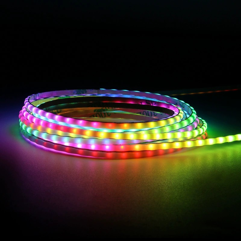 The addressable RGB LED strip lights suit for billboard light decoration, cinema, and bar atmosphere decoration. The addressable RGB strips cutting length is 10cm.
